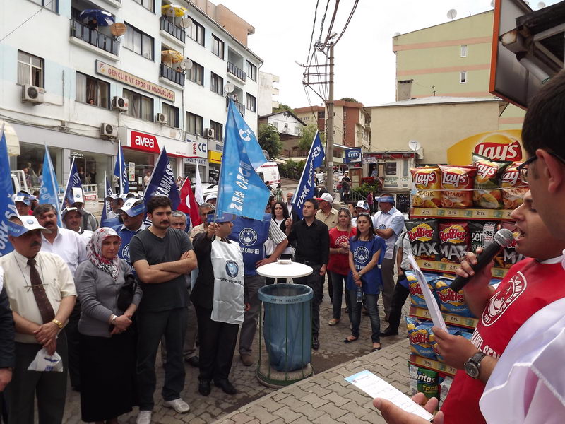 Ardından saat 11.30 sularında Türkiye Kamu-Sen Konfederasyonuna bağlı sendikaların üyeleri meydana indi. Türkiye Kamu-Sen adına basın bildirisini Artvin İl Temsilcisi Uğur Özer okudu. Özer’in alkış ve sloganlarla kesilen konuşmasında şu ifadelere yer verdi;