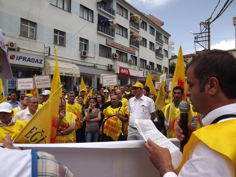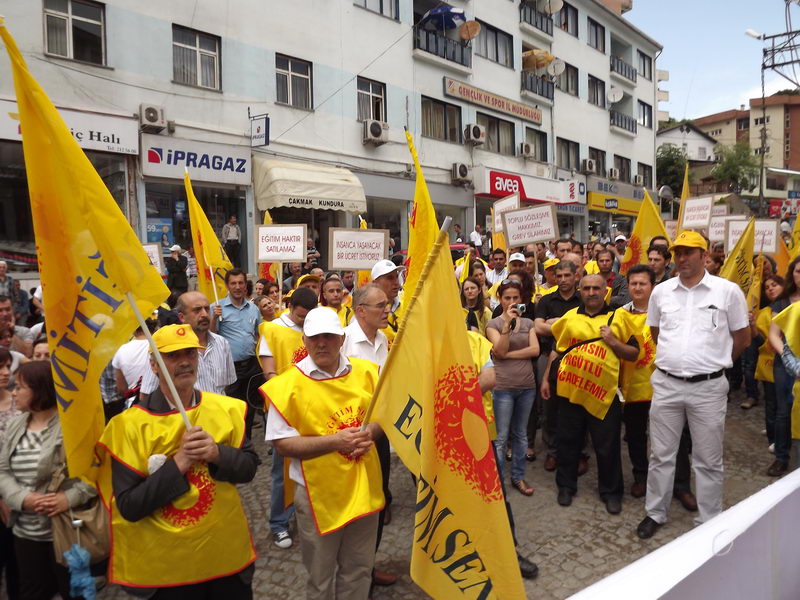 Türkiye genelinde iş bırakma eylemi kararı alan Eğitim Bir Sen, Artvin´de de iş bırakarak Kapalı Otopark önünde saat 11.00´de basın açıklaması yaptı. Eğitim Bir Sen´in eylemine Memur Sen´e bağlı diğer sendikalarda iş bırakarak ve basın açıklamasına katılarak destek verdiler. Basın açıklama metnini Memur Sen Artvin İl Temsilcisi ve Eğitim Bir Sen Artvin Şube Başkanı Bahattin Yetim okudu. Açıklama sonunda "Hükümet zammını al başına çal", "Başbakan uyuma memuruna sahip çık", "Ek ödeme hakkımız söke söke alırız", "Şimşek istifa" sloganları atıldı.