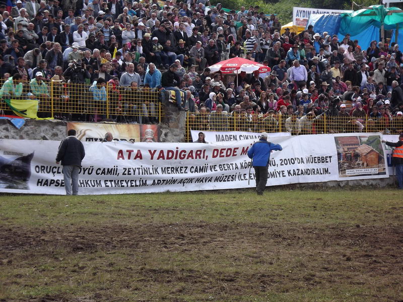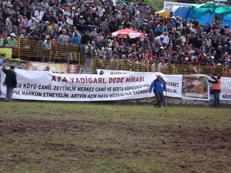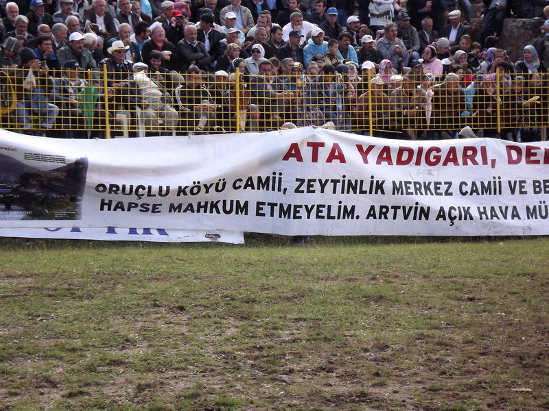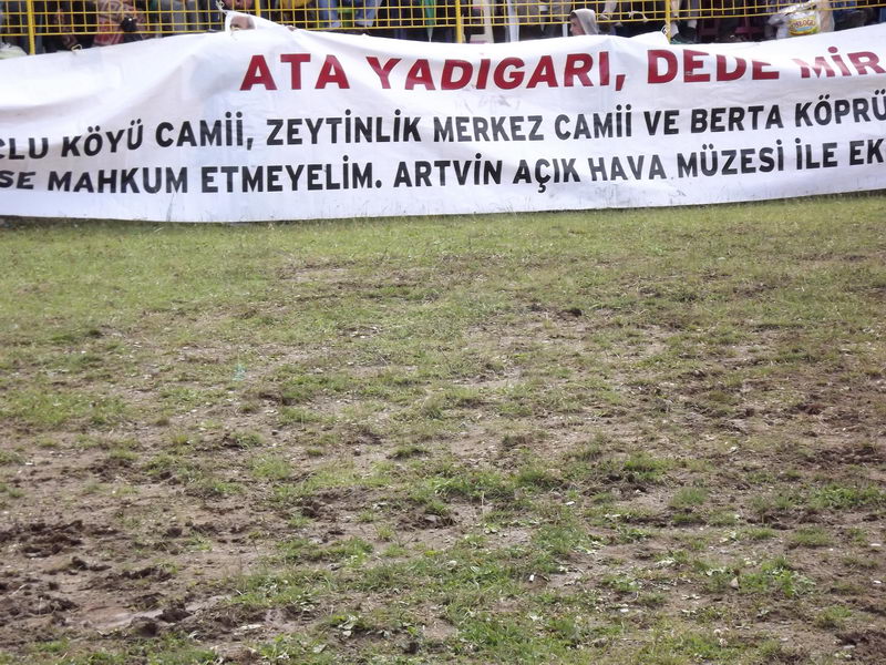 Deriner Barajı yapımı sırasında başlattığı mücadele ile baraj göl suyu altında kalacak tarihi eserleri kurtarmaya çalışan 57 yaşındaki Zeki Kurt, Kafkasör Arena’da pankart açtı.